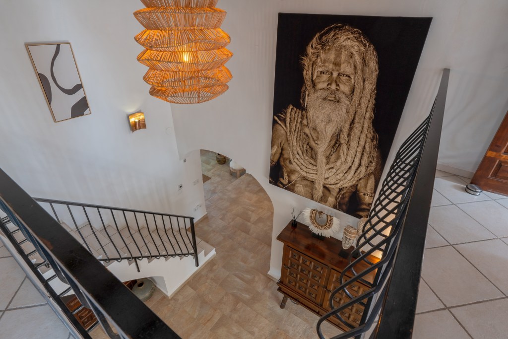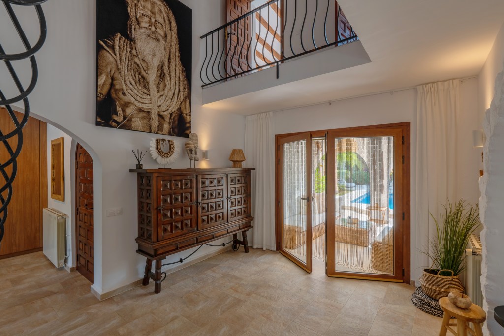 - De open hal komt uit op de Naya (spaans voor overkapping) aan de voorkant van het huis met mooi zicht op het zwembad en de tuin. Onder de Naya staan heerlijke loungebanken en op het terras staat een grote eettafel en vind je heerlijke lounge bedden en stoelen.